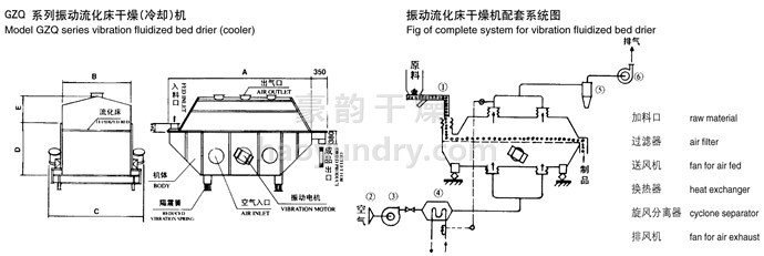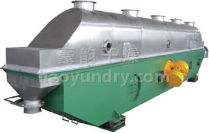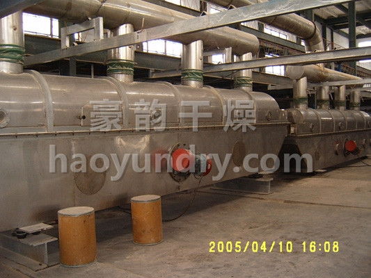 物料自进料进口进入机内,在振动力作用下,物料沿水平面流化床抛掷,向前连续运动,热风向上穿过流化床同湿物料换热后,湿空气经旋风分离器除尘后由排风1:3排出.干燥物料由排料进口排出。