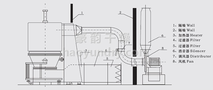 空气经加热净化后,由引风机从下部导入,穿过料斗的孔网板。在工作室内,经搅拌和负压作用形成流态化,水份快速蒸发后随着排气带走,物料快速干燥。