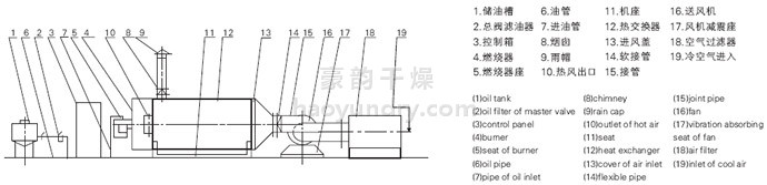 燃料通过燃烧器燃烧,产生高温燃气。并借助具有强化换热措施的热风炉将高温燃气的热量传导给被加热的空气,高温燃气经热量散发后温度降低至250℃后排到大气中。需加热的空气通过选配的鼓风机强送入热风炉,吸热后温度升至额定值从热风出口处送出,当热风温度达到额定温度上限时,燃烧器会自动停止燃烧或自动转为小火焰燃烧,当热风温度降低到额定下限温度时,燃烧器又会重新点燃运行或转为大火燃烧,升温的速度可以调节进风阀的开度来实现。